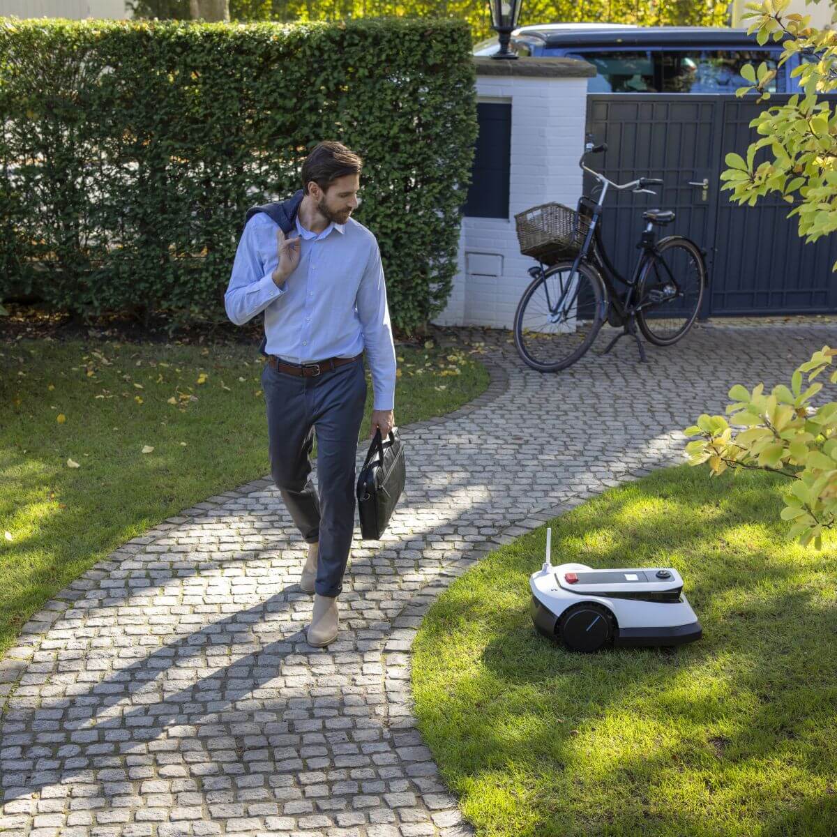 Z bezpečnostných dôvodov sa kosenie automaticky pozastaví v prípade, ak sa robotická kosačka zdvihne nad zem alebo prevráti. Kosiaci kotúč so žacími nožmi je navyše umiestnený v dostatočnej vzdialenosti od vonkajšej hrany robotickej kosačky. Predný nárazník zas robotickú kosačku chráni pred nečakanými kolíziami.